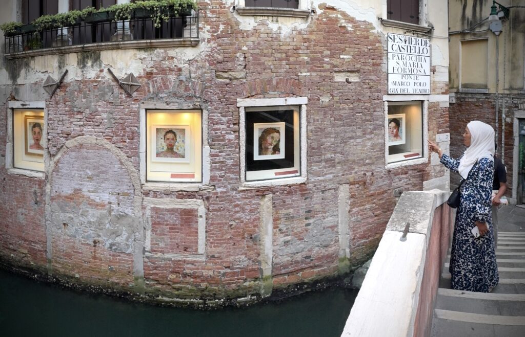 Dall’estate 2025, l’intera serie >> Fantastic Portraits—parte del progetto Puzzling Pop—è esposta per la prima volta integralmente a Venezia, allestita in sette vetrine di un antico ex negozio, oggi Spazio Gabbiani, un tempo dimora di Casanova e affacciato sulla casa natale di Marco Polo. A differenza delle tradizionali mostre in galleria, i ritratti si affacciano verso lo spazio pubblico: alcuni su un vivace canale solcato da gondole, altri su una calle affollata di visitatori da tutto il mondo. I loro sguardi surreali incrociano quelli degli sconosciuti, generando un dialogo imprevedibile che trasforma l’esposizione in una vera forma di arte pubblica, intrecciata con l’architettura, le vie d’acqua e il flusso cosmopolita di Venezia. Realizzati in collaborazione con Bugno Art Gallery, ciascun ritratto è composto da 63 tessere fotografiche ottenute da frammenti di ali di farfalla. Questa struttura ridotta amplifica la distorsione, generando figure cariche di un’energia inquietante—echi dell’automatismo surrealista. Le fisionomie deformate risuonano con la fragilità del clima odierno, evocando ansia e conflitto e, al tempo stesso, costringendo lo spettatore a incontri fugaci di empatia. In questa sinergia di luogo, immagine e umanità, questo progetto di arte pubblica diventa uno specchio delle paure e delle incertezze collettive, un rituale pubblico di confronto e catarsi che lascia intravedere un potere quasi terapeutico dell’arte.