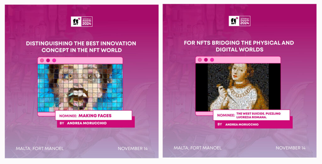 Un paio di progetti NFT di Morucchio, APOTI – Making Faces e THE WEST SUICIDE—come HSTORY ALREADY ABSOLVED ME—si pongono in netta opposizione alle convenzioni dell’ambiente dell’arte contemporanea occidentale, spesso allineato con le strutture di potere liberal globaliste e con le narrazioni mainstream. Nel 2024, i progetti NFT di Morucchio hanno ricevuto riconoscimento internazionale con una doppia nomination alla 3ª edizione dei ftNFT YoCerebrum Awards, tenutasi a Malta il 15 novembre 2024. Morucchio è stato selezionato in due categorie: “Collezione NFT più innovativa” per APOTI – Making Faces e “Miglior progetto phygital” per THE WEST SUICIDE: Puzzling Lucrezia Romana. APOTI – Making Faces è una serie di 33 ritratti NFT animati, ciascuno costruito da intricati collage digitali di ali di farfalla. Attraverso mutevoli espressioni facciali—rabbia, ironia, risata, imbarazzo, sorpresa—I personaggi incarnano reazioni emotive istintive contro la disinformazione e il condizionamento culturale imposti dai media occidentali mainstream e dai sistemi di potere. THE WEST SUICIDE: Puzzling Lucrezia Romana, parte della serie Puzzling Renaissance reinterpreta un dipinto del XVI secolo di Lucrezia Romana, realizzato da Lucas Cranach il Vecchio. Trasformata in un’opera phygital dinamica; La figura a mosaico di Lucrezia si muove, la sua daga colpisce infine, liberando un’ondata di tessere rosse. L’opera diventa una potente metafora del “suicidio dell’Occidente”—una critica all’incompetenza politica, alla manipolazione culturale e alle scelte geopolitiche autodistruttive che accelerano il declino della civiltà occidentale in particolare l’Europa.